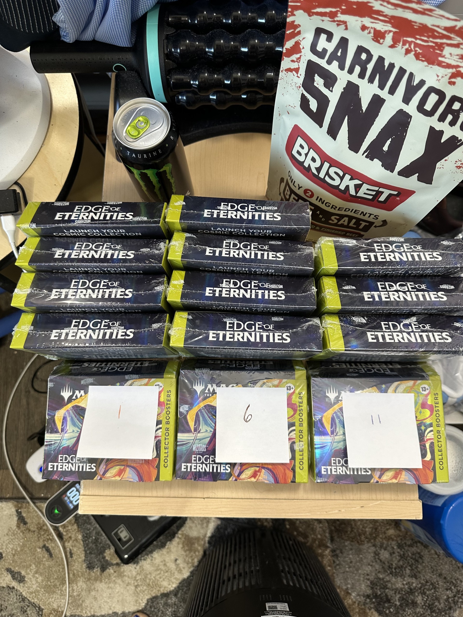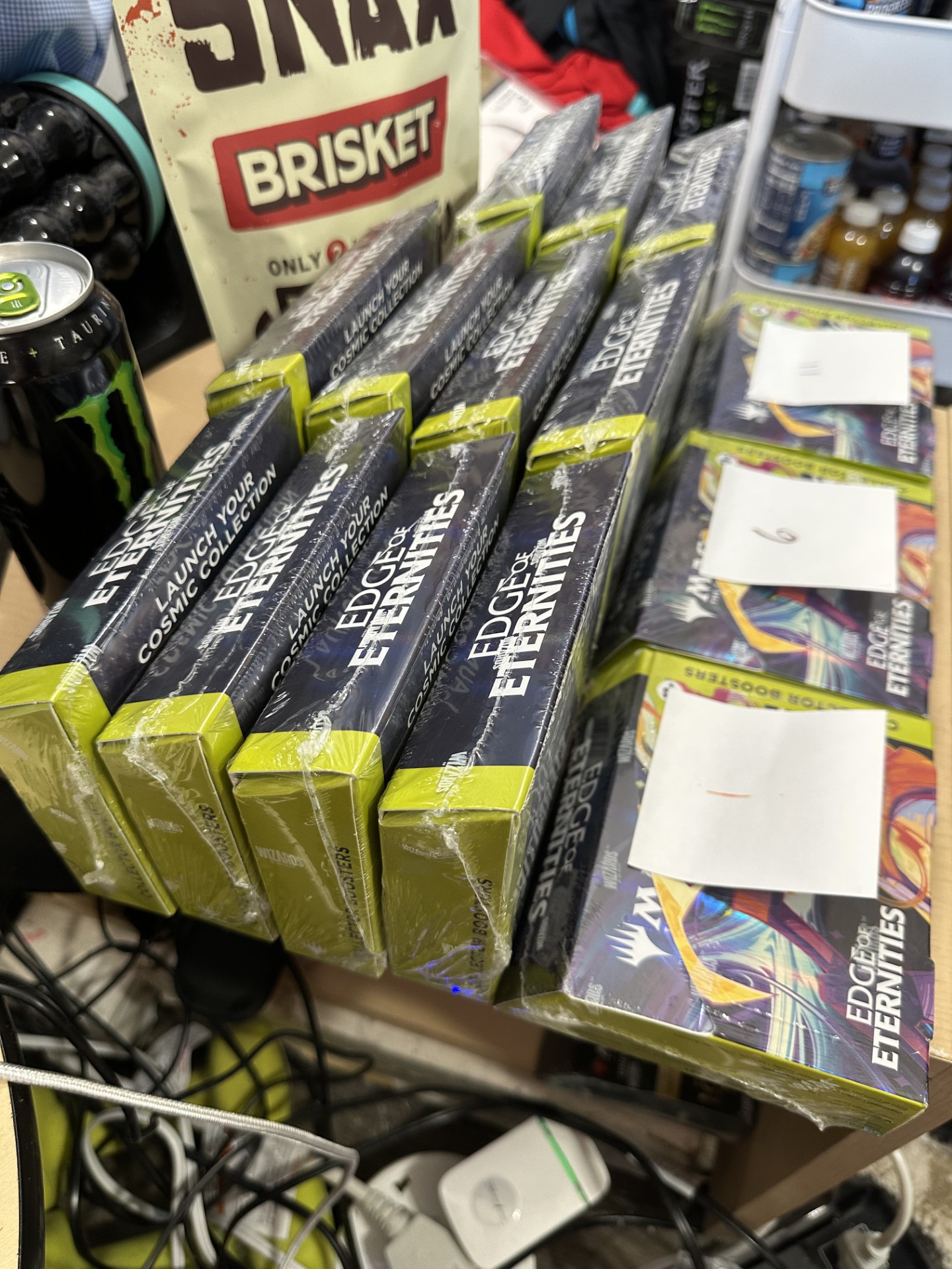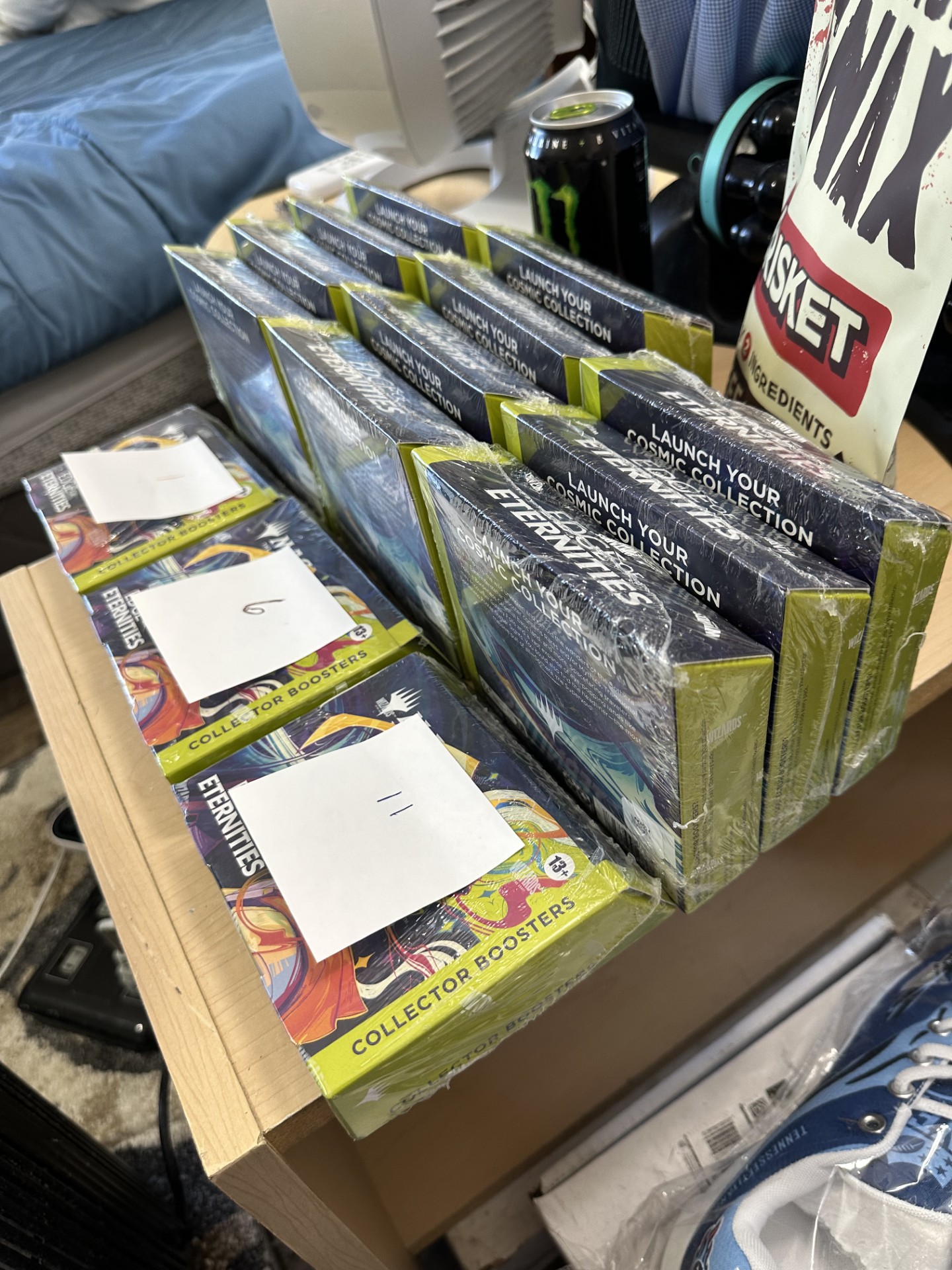 DESCRIPTION OF EBAY AUCTION: $7,995 FREE SHIPPING FOURTEEN (14) EDGE OF ETERNITY COLLECTOR BOOSTER BOXES (see pics). Everything pictured in this auction is up for purchase as well at $9,900. It is a 3 days duration Ebay auction (bidding). My loss is your gain. If anyone is interested in buying directly from a distributor for MTG, email me at MTG FOUNDATIONS AT GMAIL (COM) (no spaces) or thru EBAY for me to become your personal distributor. I can take on 8 individuals right now. Each EoE would cost you only $330. I have everything from Alpha booster boxes to LOTR. I will ship first.